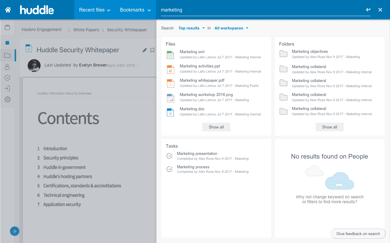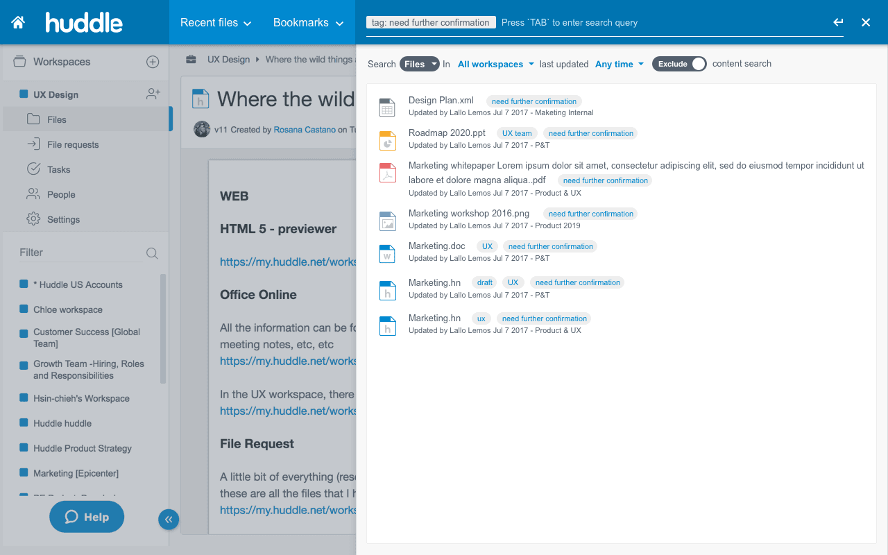 Huddle is an online document collaboration SaaS platform where organizations or teams purchase high-security cloud storage. However, due to different organizational habits, it’s common for workspace admins to move or restructure folders and files, making it challenging for users—especially those new to the workspace—to locate specific documents.