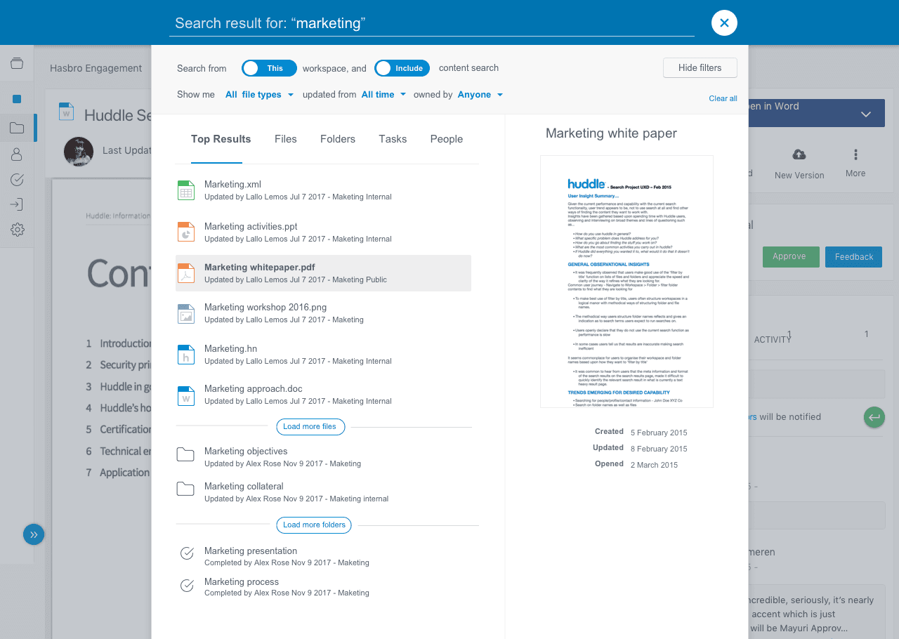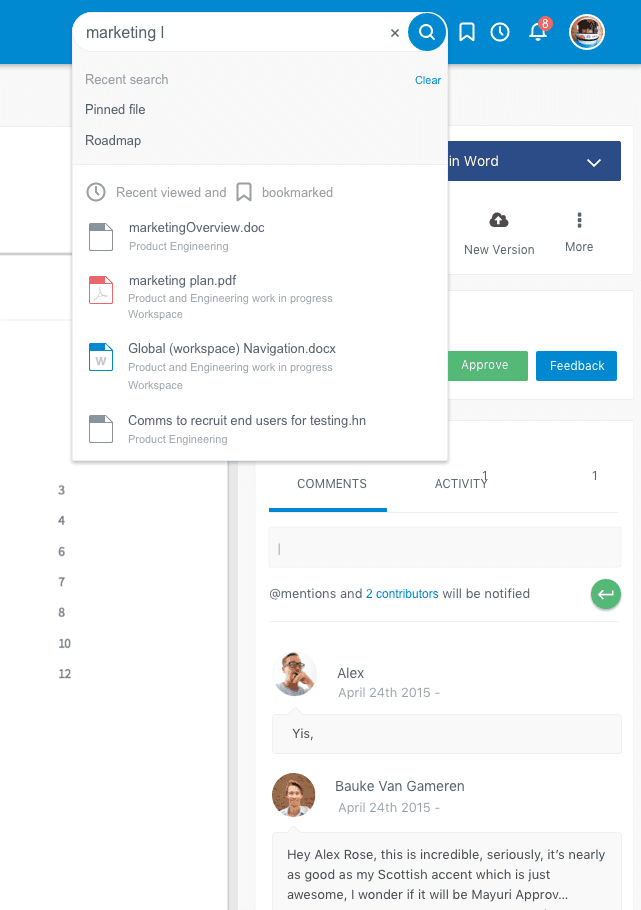 Enhanced search function improving file discoverability, reducing user burden, and amplifying team collaboration.
