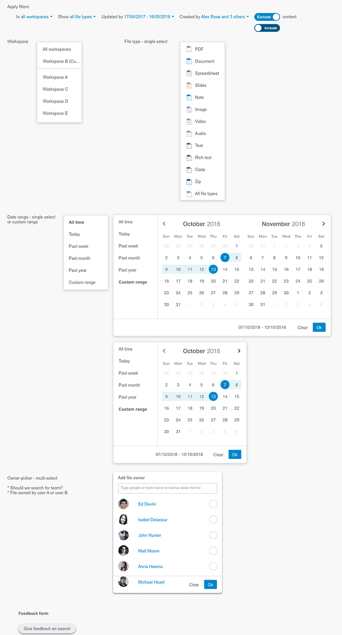 After testing, and given that the current search function includes a two-stage process for performance reasons, the design and UX should ensure users clearly understand the second stage. This stage involves a larger search space, offers more filter functions, and can return a greater number of files.